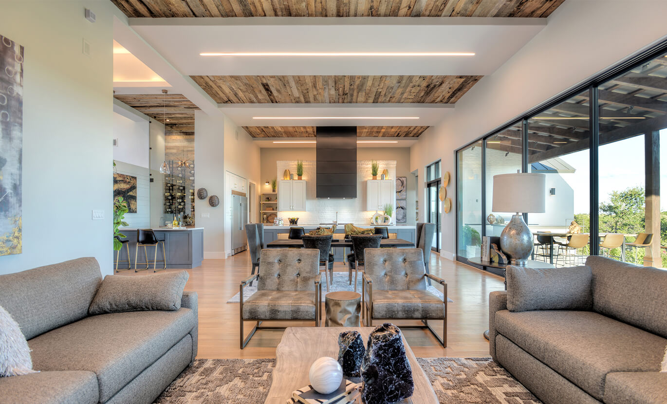 This American transitional home is a true beauty with reclaimed wood ceilings and warm wood features throughout.