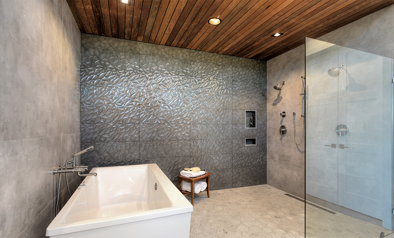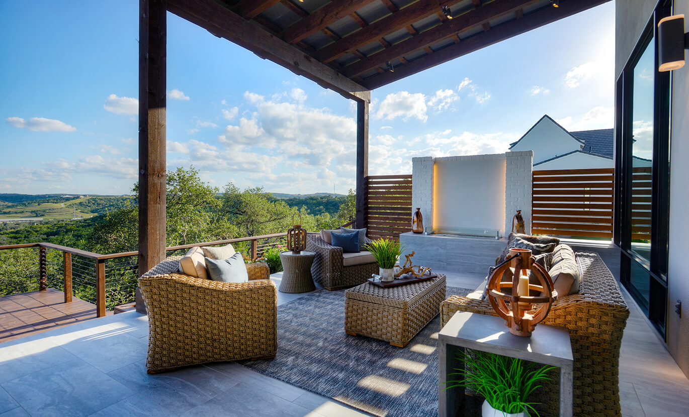 The open floor plan and high ceilings of the kitchen, dining, and great room are mirrored with the same outdoor spaces, which paired with the uncovered deck cantilevered over the dramatic topographical changes in the property, make entertaining outdoors an effortless event.