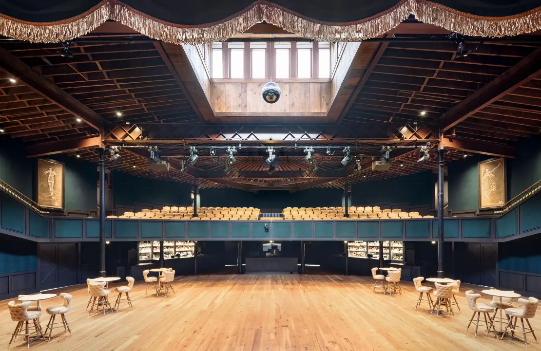 Constructed in 1894, Stable Hall’s iconic oval shape makes it one of the most heralded buildings in the district and this undoubtedly set the scene for its transformation from utilitarian workhorse to a distinctive cultural venue with echoes of intimate early 1900s theater, classic Texas dance hall, and state-of-the-art concert venue.