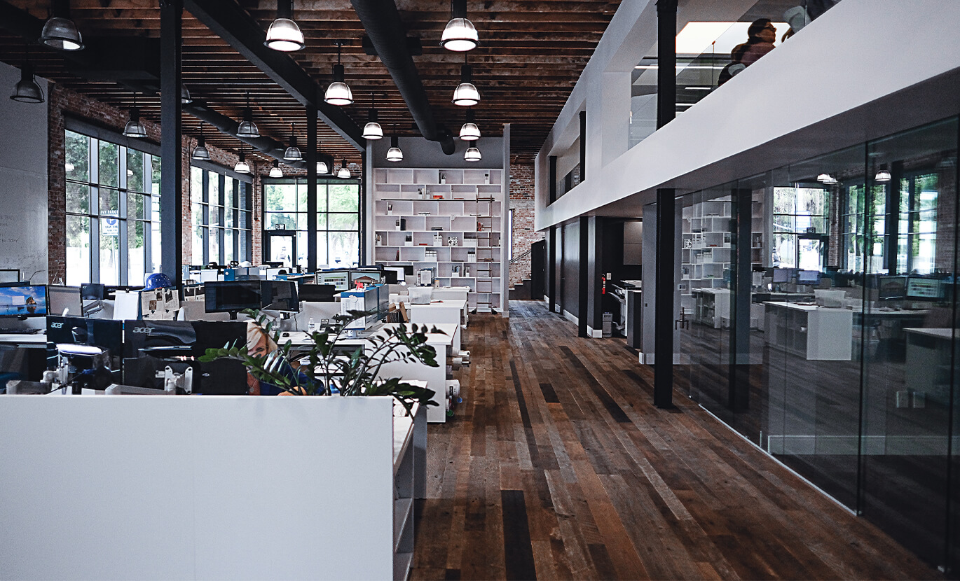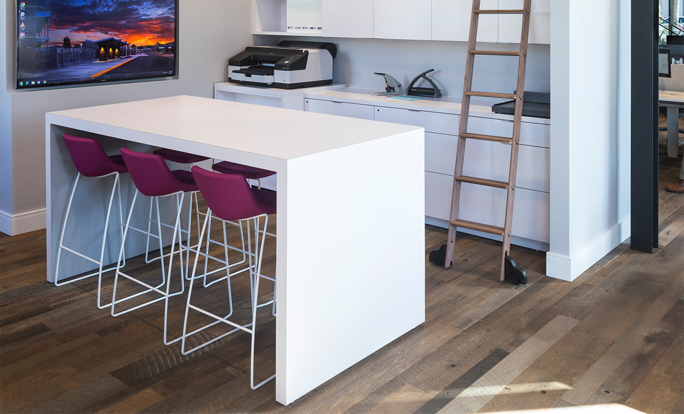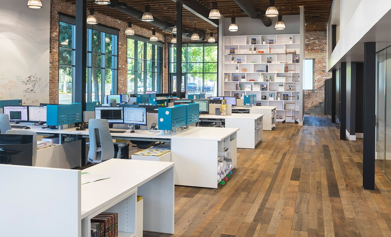 This office space is a perfect blend of clean, modern furniture mixed with a warm, rustic wood flooring.