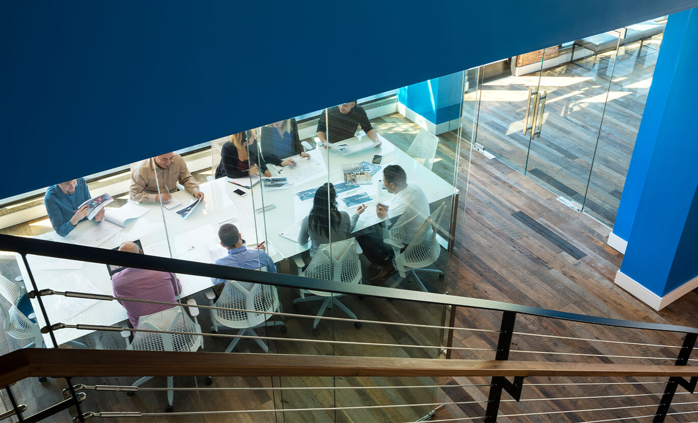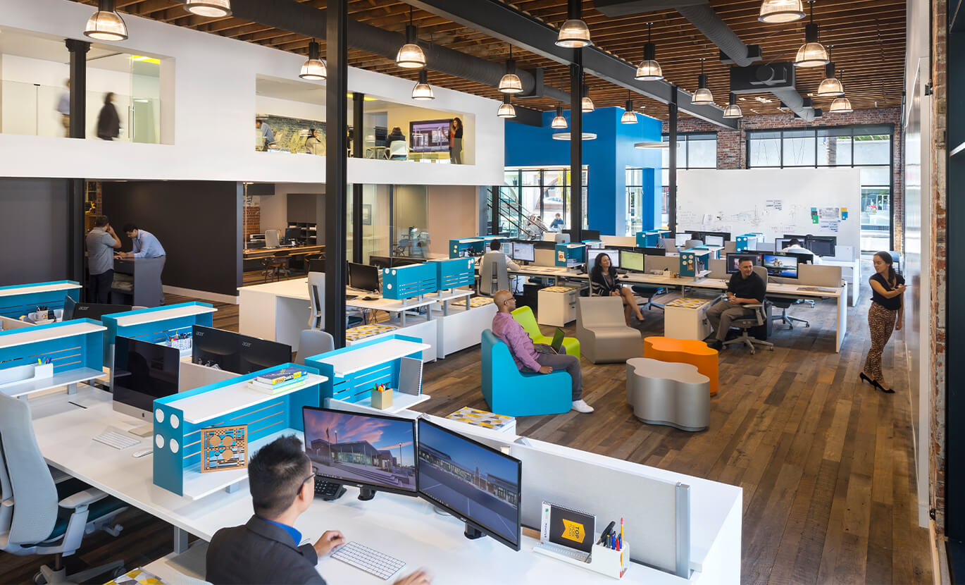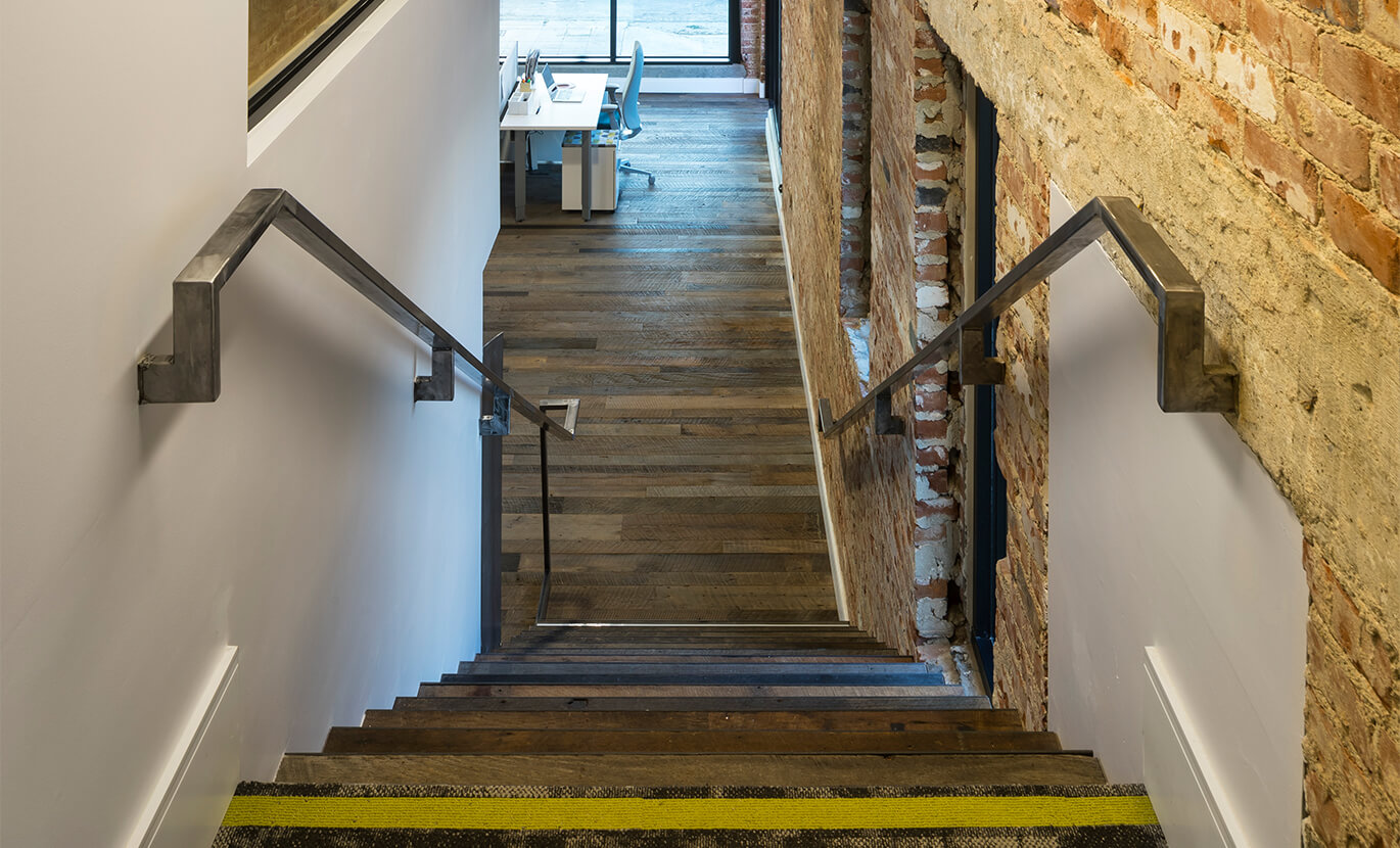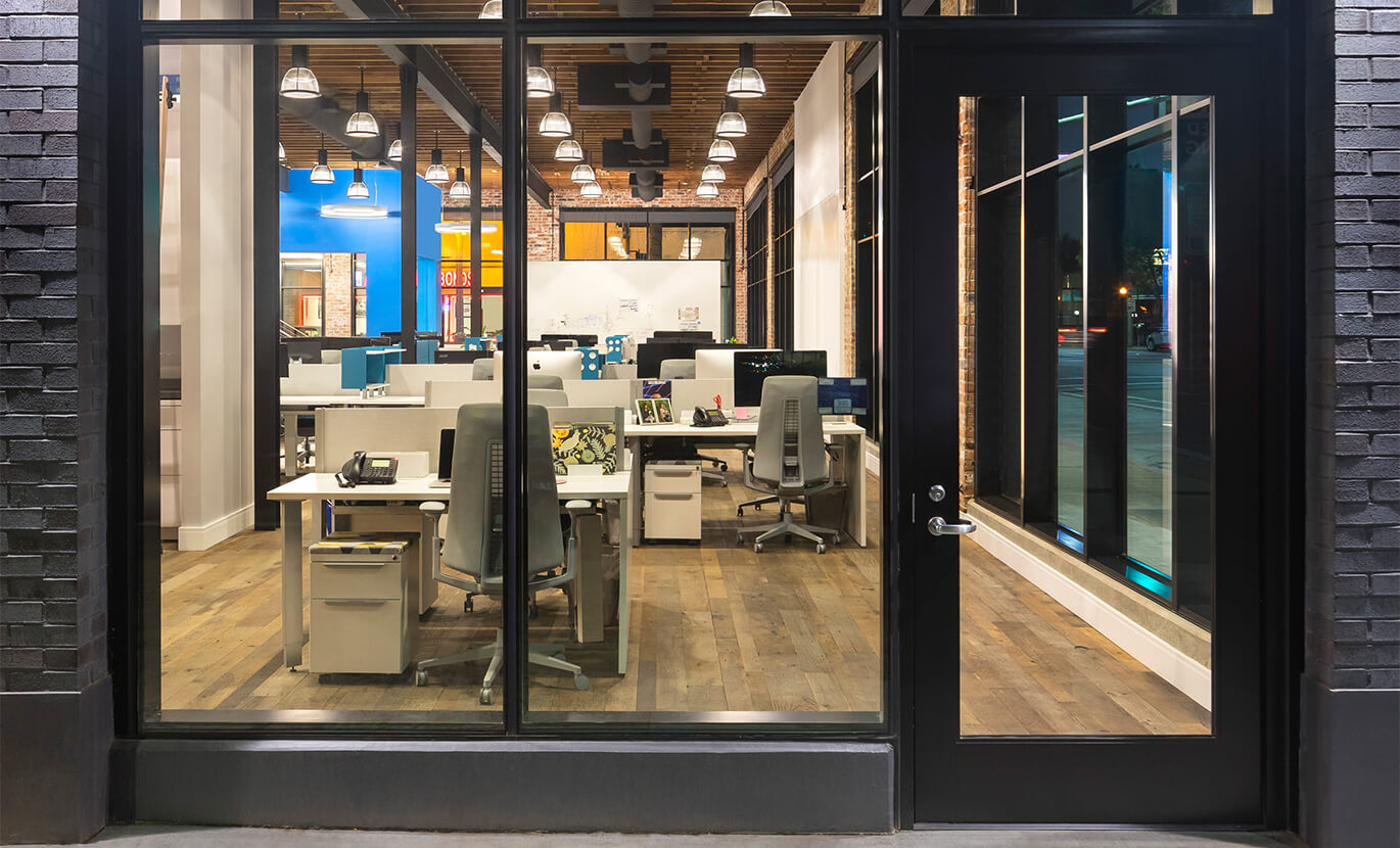 This office space is a perfect blend of clean, modern furniture mixed with a warm, rustic wood flooring.