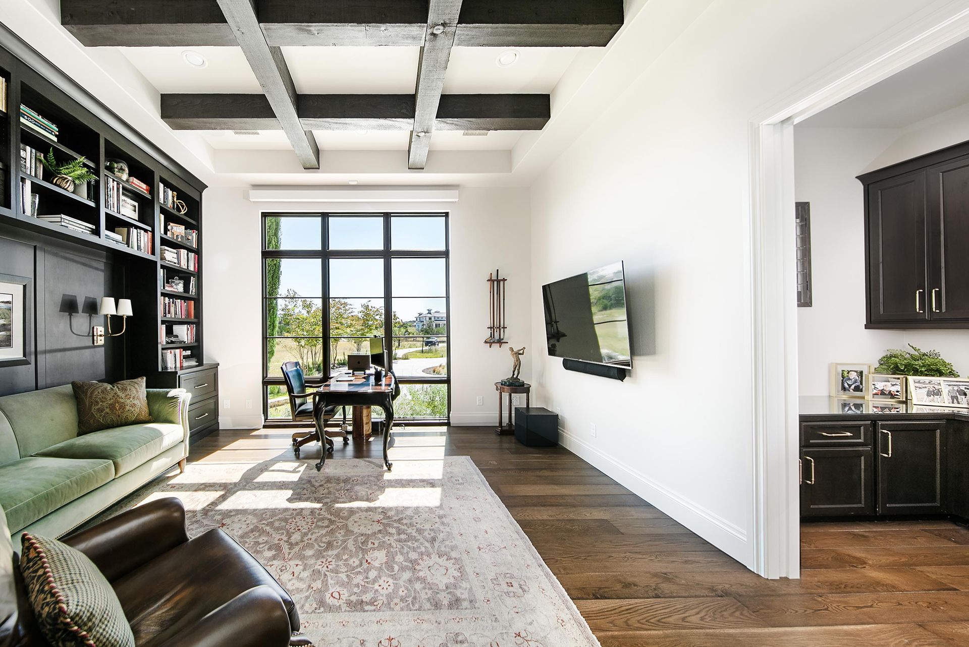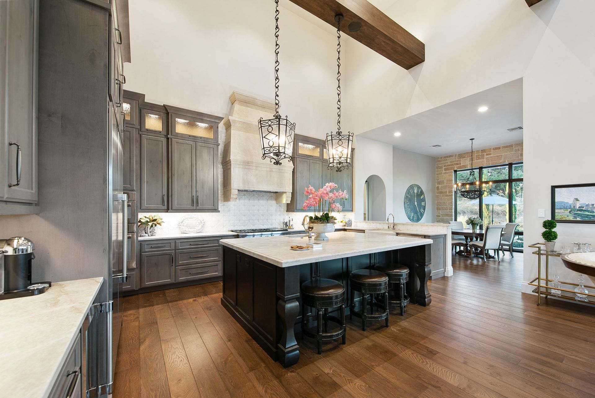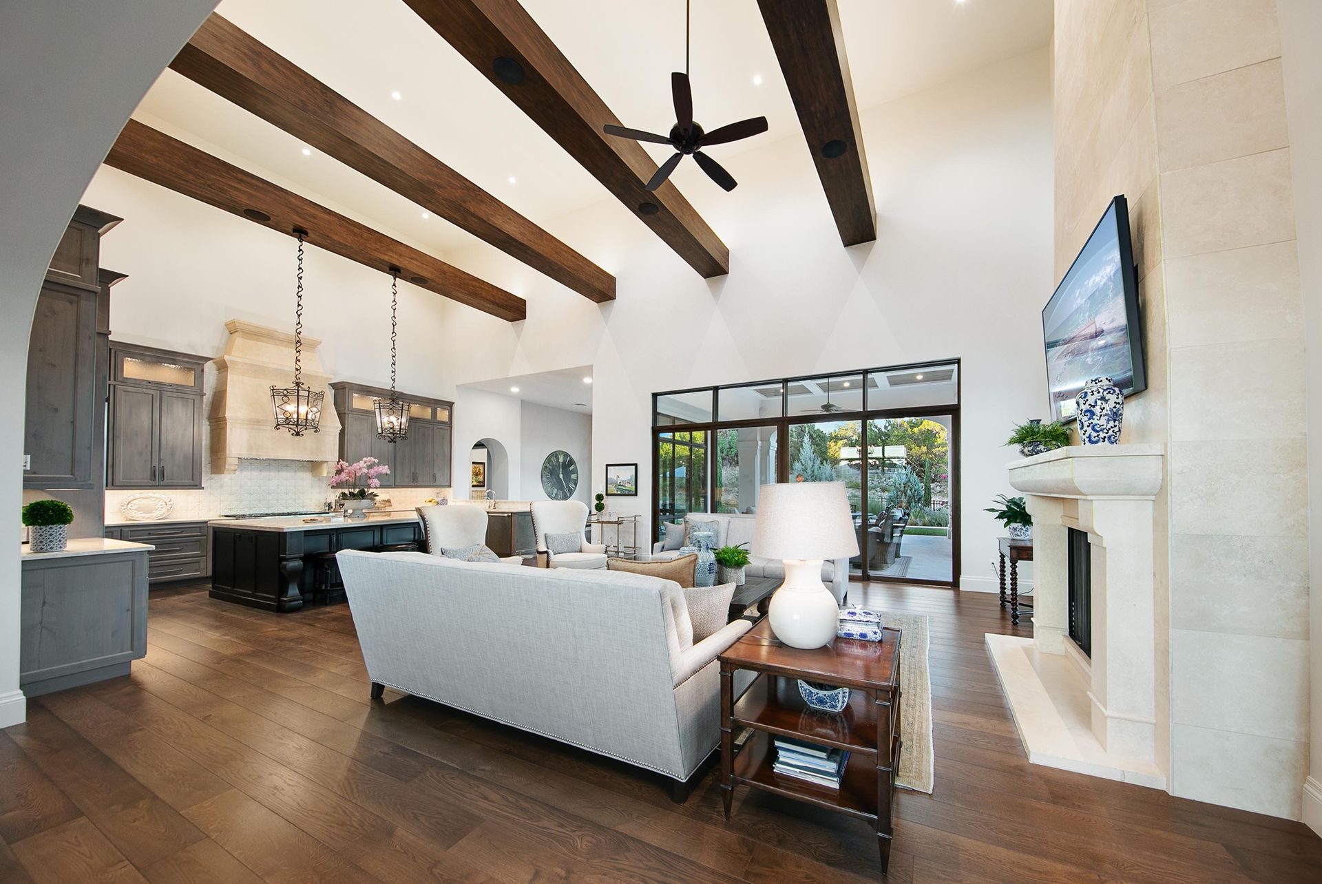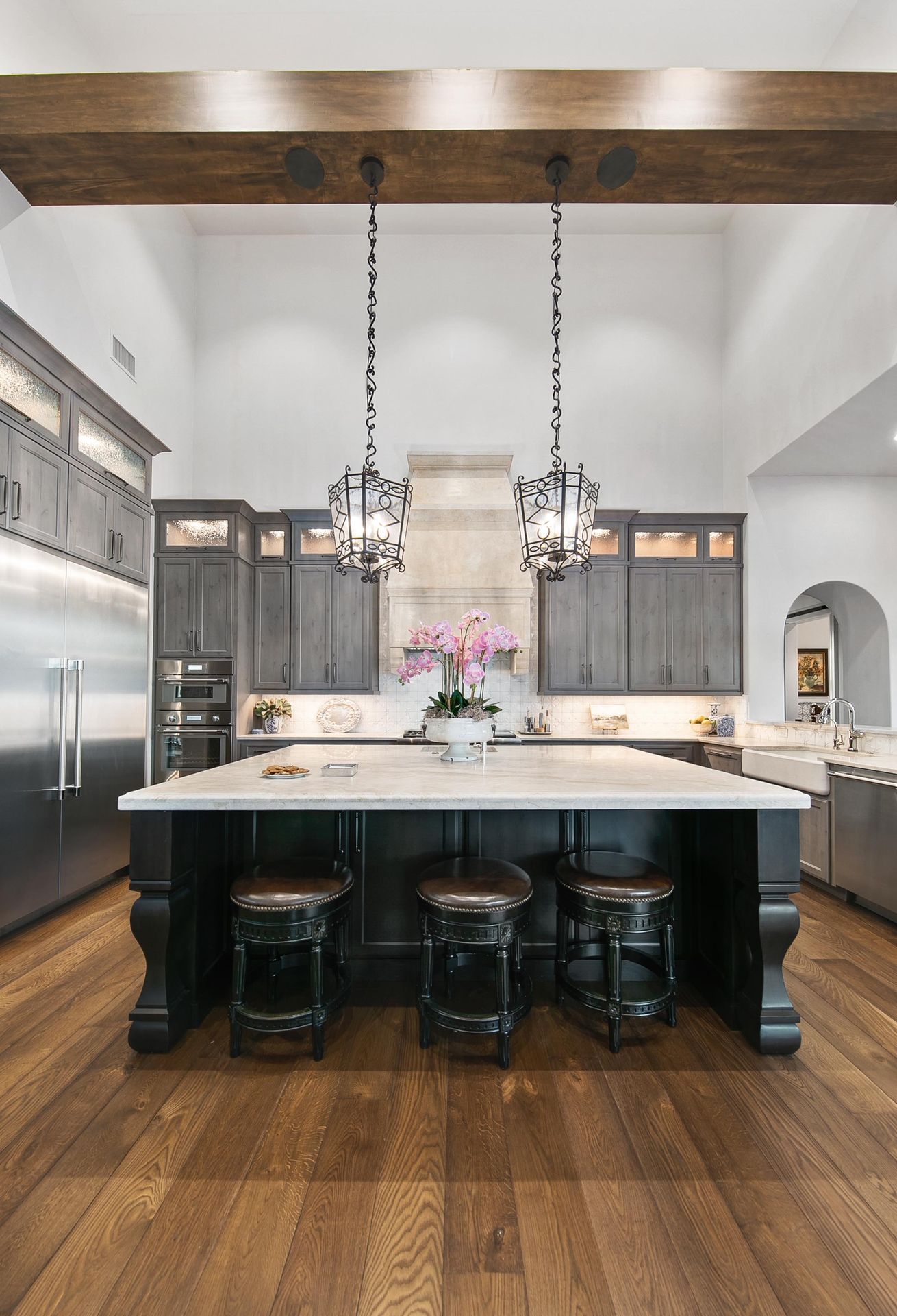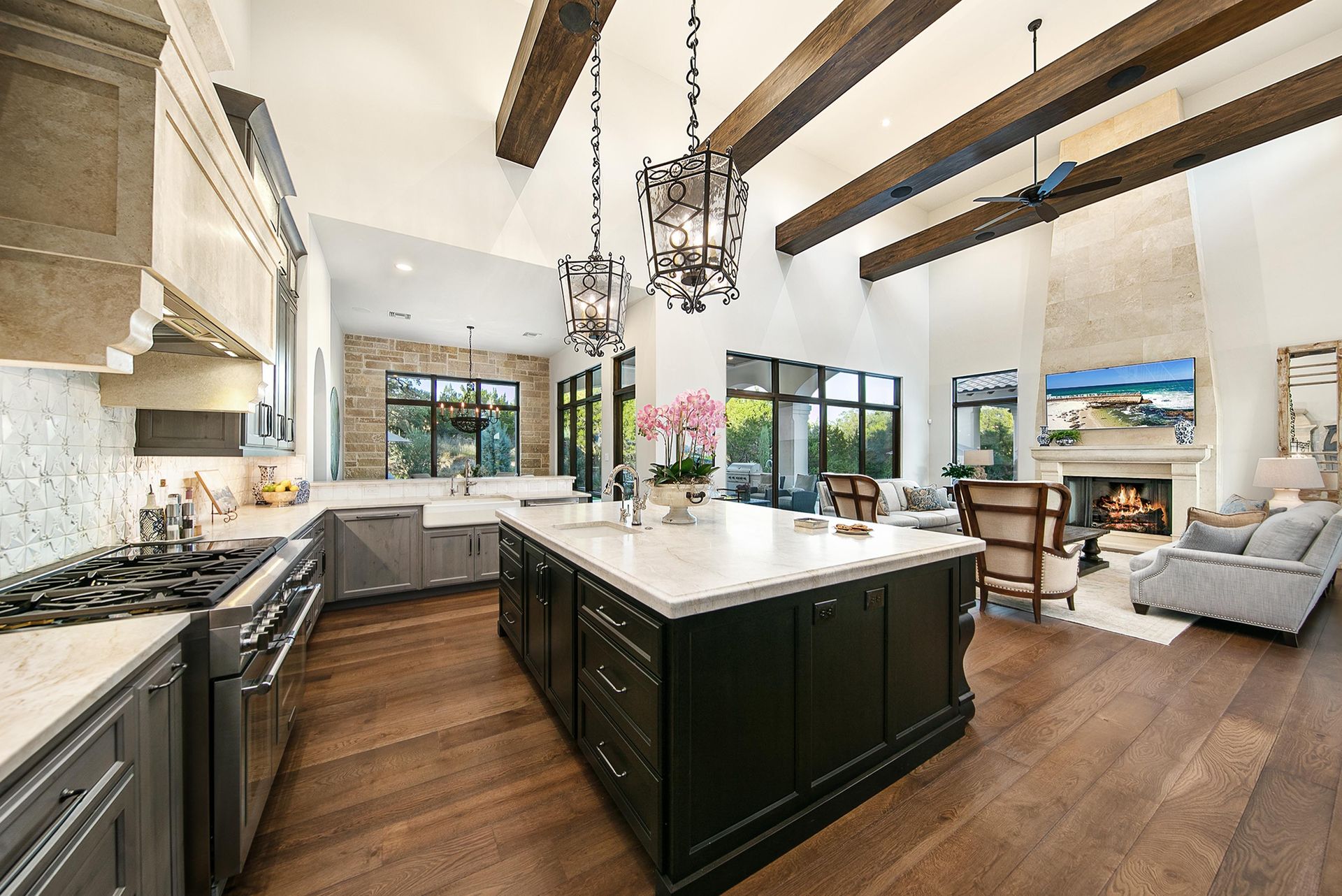 Soaring ceilings in the kitchen & living room are highlighted by massive “floating timbers” suspended from the ceiling above.