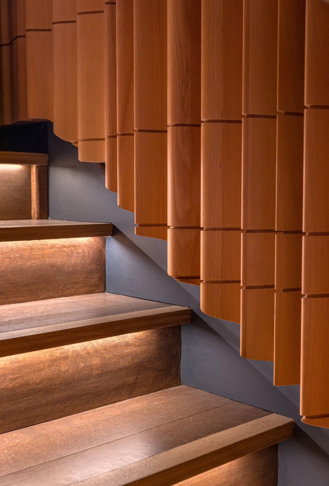 The walls of the concert hall are clad in beech wood panels that were sculpted to reverberate sound to better render the orchestra's performance. The undulating wood panels are inspired by the mathematical shapes of sound waves, reflecting and diffusing the sound.