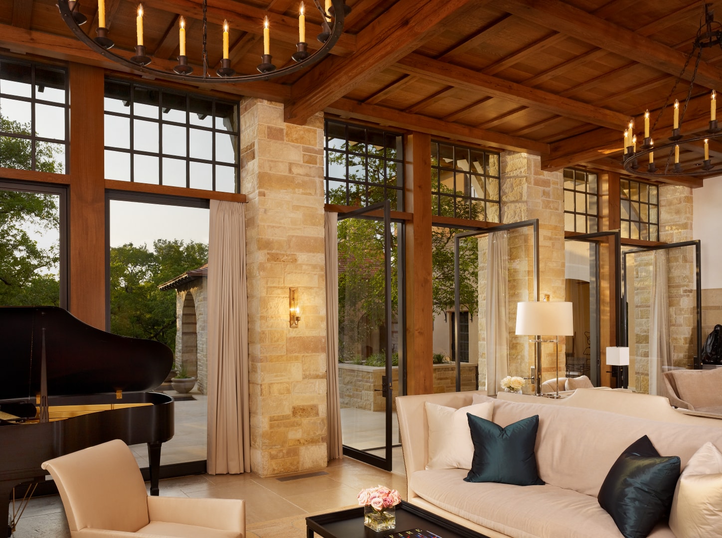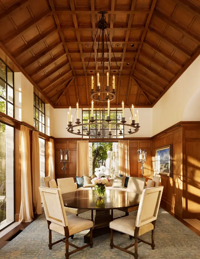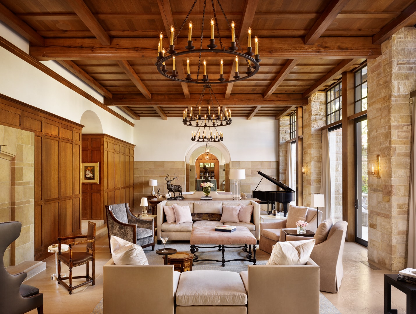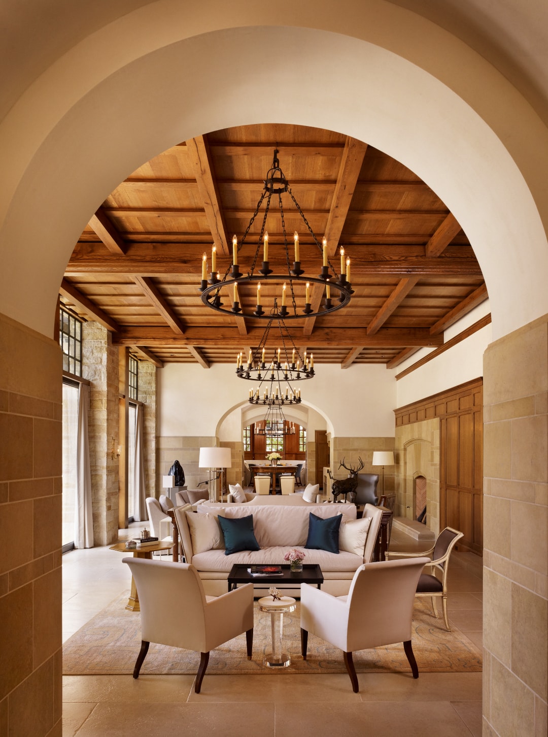 The aesthetic at Turnberry is unapologetically timeless. Bare plaster walls and cut stone wainscoting combine with white oak beams and rift and quartered white oak paneling throughout the home, while heavy iron chandeliers evoke past times.