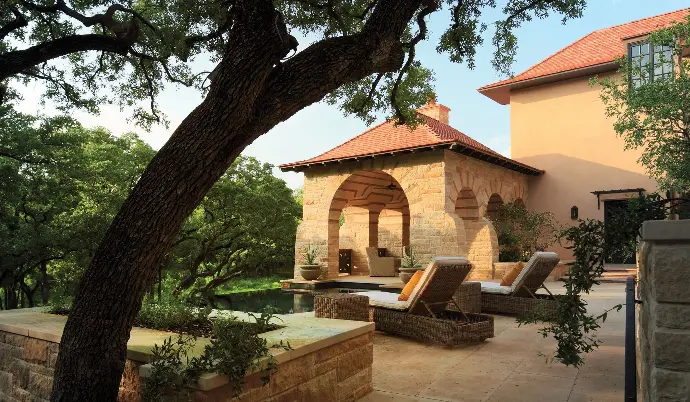 While its influences originate across the pond, their expression at Turnberry Manor is quintessentially Texan, with vernacular materials including Texas limestone, red clay tile and white oak infusing the property with a rustic air that grounds it in the landscape.